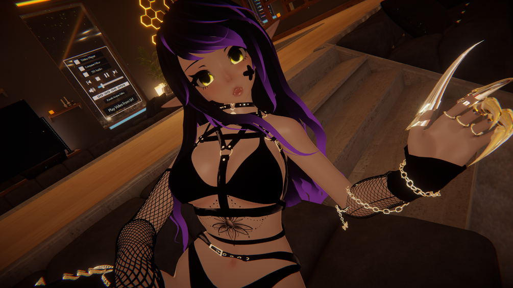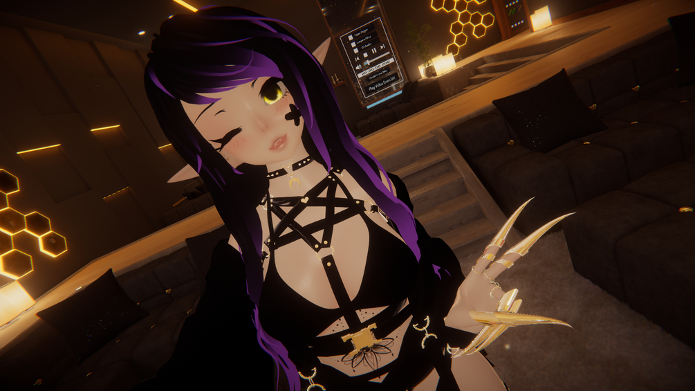 - Credits : Base by Pandaabear#9873 - Face by Cicieaaa#7777 - Cat ring by wen#4076 and teabeepea#3773 - Moon ring by jellybean#5150 -  Thigh highs by Len#1000 - Round glasses and Bra by Alc#0002 - Elf ears by DOGU#0271 - Left fishnet sleeve by Dream#6543 - Hand chain by berryvee#0697 - Buckle garter by glitch#0112 - Boots by Gashina#1960 - Panties and Pasties by brae#2007 - Locomotion layer: WetCat#6969 & Alc#0002 - Jacket, Right fishnet, Claws, Choker, buttharness and pentagram harness by Darcy#0005 - Body texture by Uni#1369, Edited by me and Kaeris who created the tattoos on the body ( You are not allowed to reuse the edited texture with the tattoo on it.) - Hairs and Toy model by WetCat#6969 - Strap by Jorgen#2328 - Paddle by Eliza#1337 - Matcaps by Shugan#5652 - Eye texture by Minichibi#0001 - Tongue by 𝕭𝖆𝖇𝖞𝖌𝖎𝖗𝖑 𝕬𝖍𝖗𝖎♡#6969 - DPS by Raliv#3574. Thanks to all of you ! If i forgot to credit you, or if you have a problem with one of your assets being used, please contact me on discord and i will solve that as soon as i can.